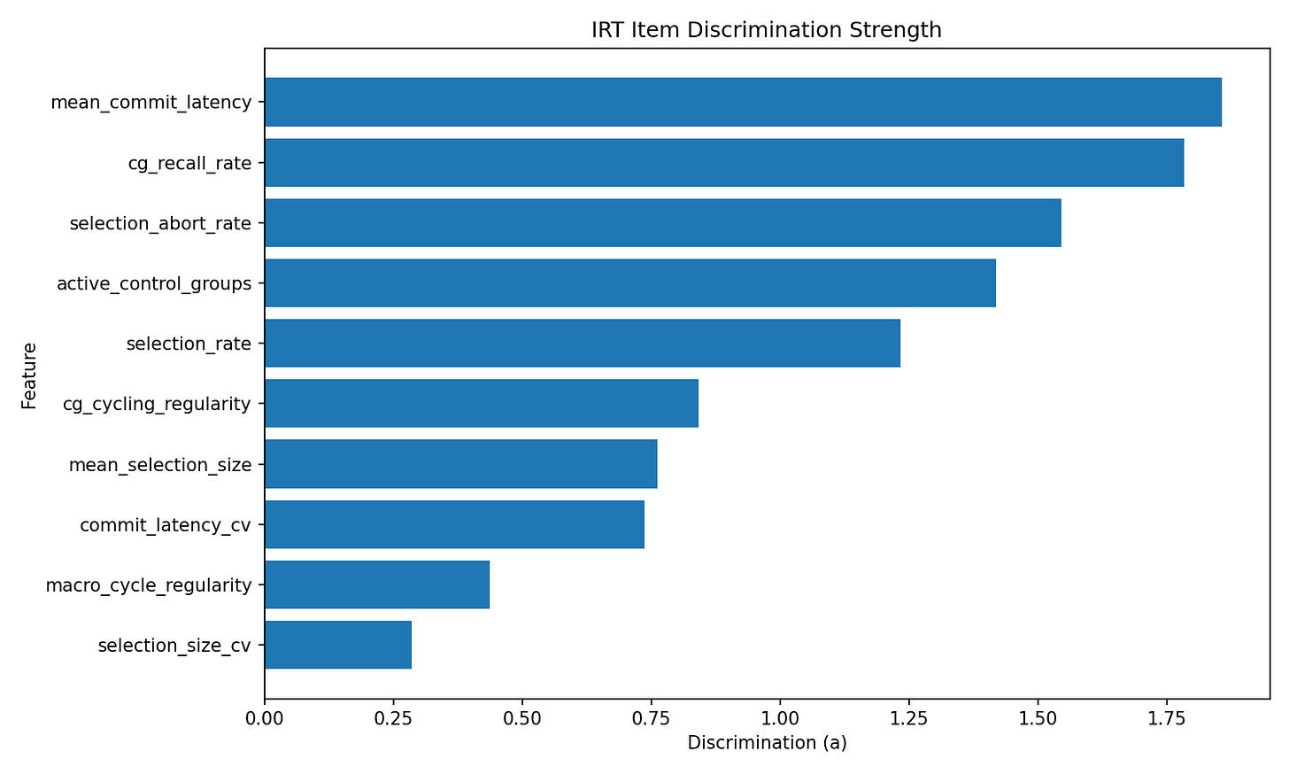 Figure 3. Item discrimination parameters from the IRT calibration. Measures of decisional latency and control group usage are among the strongest signals in the model.