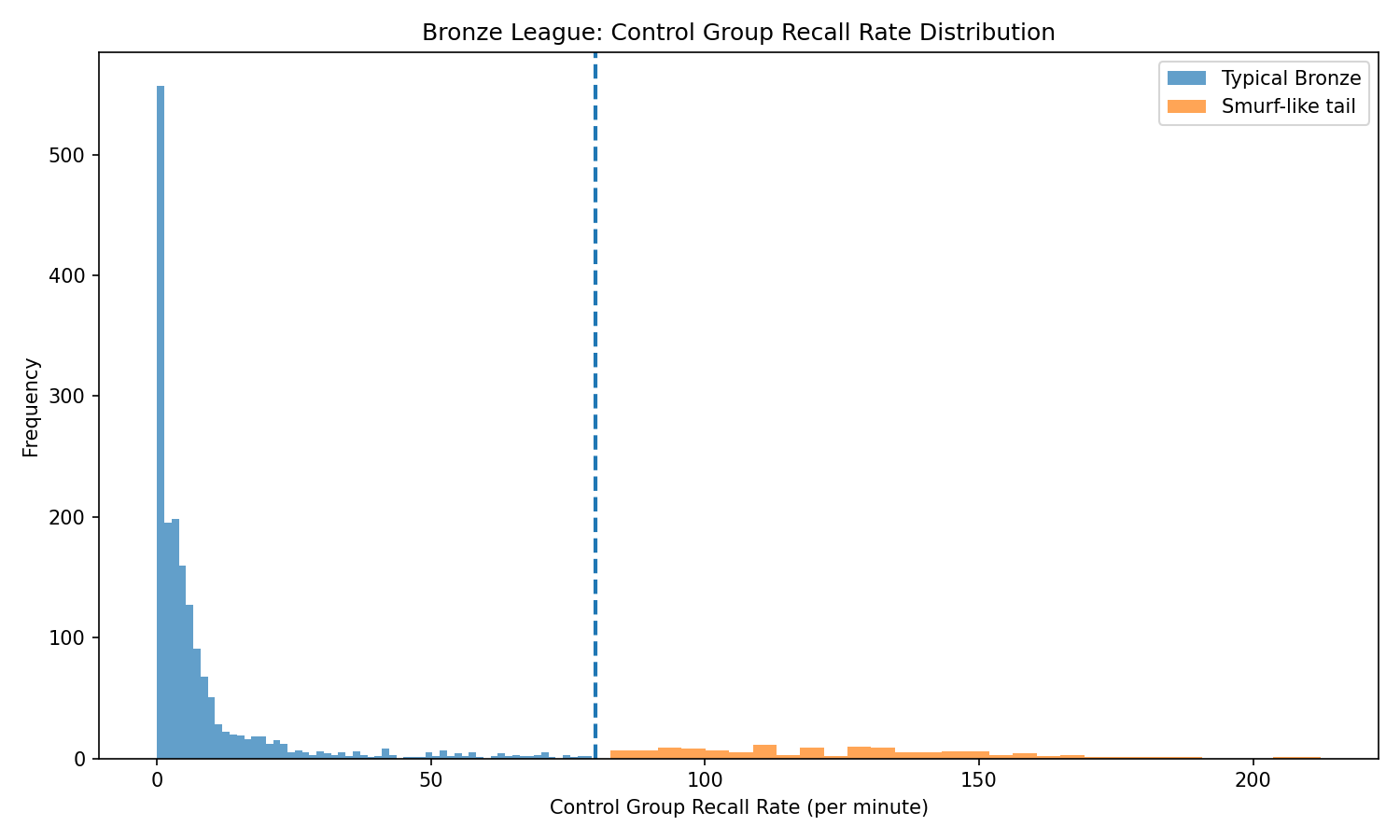 One of the clearest indicators was control group recall rate, the number of times a player re-selects pre-assigned unit groups per minute. True Bronze players tend to use control groups rarely, if at all. But some “Bronze” players were using them constantly. A threshold around eighty recalls per minute, roughly the upper tail of the Bronze distribution, separates typical behavior from something else.