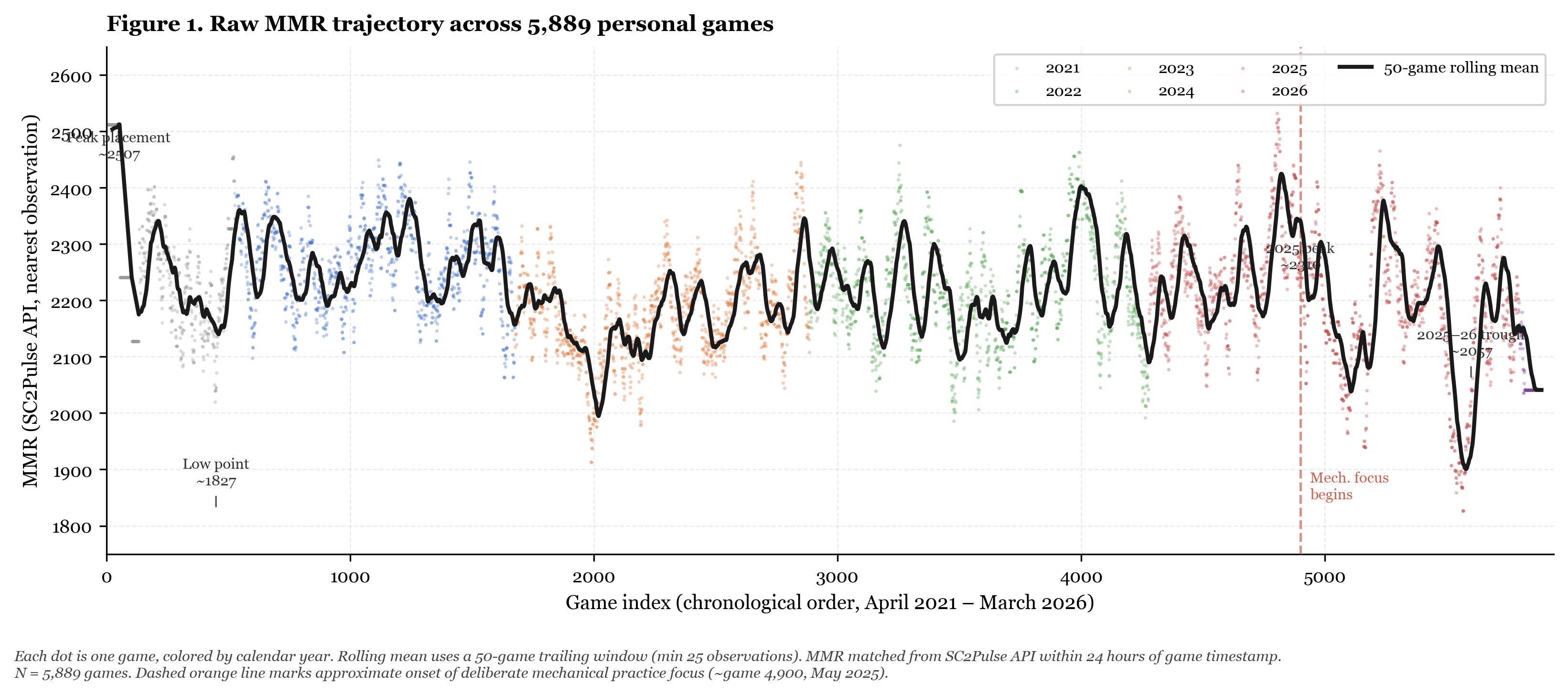 I have been playing StarCraft continuously since 2000, twenty-six years across two games and more ladder seasons than I have bothered to count. The dataset analyzed in this post covers the last five years of that history, not because I stopped playing before that, but because five years is what my current hard drive holds. My rating across that window has oscillated between 1,827 and 2,507 MMR, never breaking into Platinum, never dropping out of Gold for long. A plateau with texture but no trajectory.