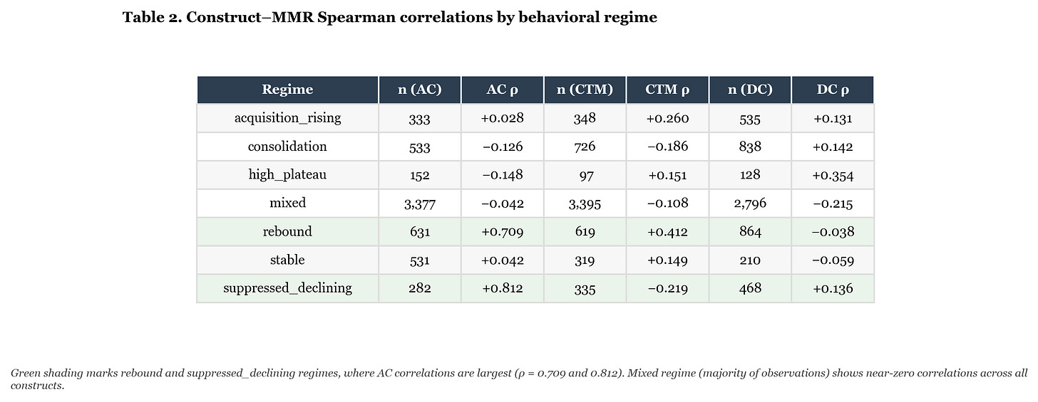 The regime classification is based on rolling behavioral scores, not on independent external labels. The suppressed_declining regime is defined by a behavioral criterion derived from the same constructs being correlated against MMR. This creates a circularity risk that a reader is right to flag. Interpreting the high within-regime correlations requires acknowledging that the regime assignment and the construct score are not independent; they are derived from the same underlying data. The correct interpretation is that certain behavioral trajectories are associated with specific MMR trajectories, not that the behavioral signal causes the MMR trajectory.