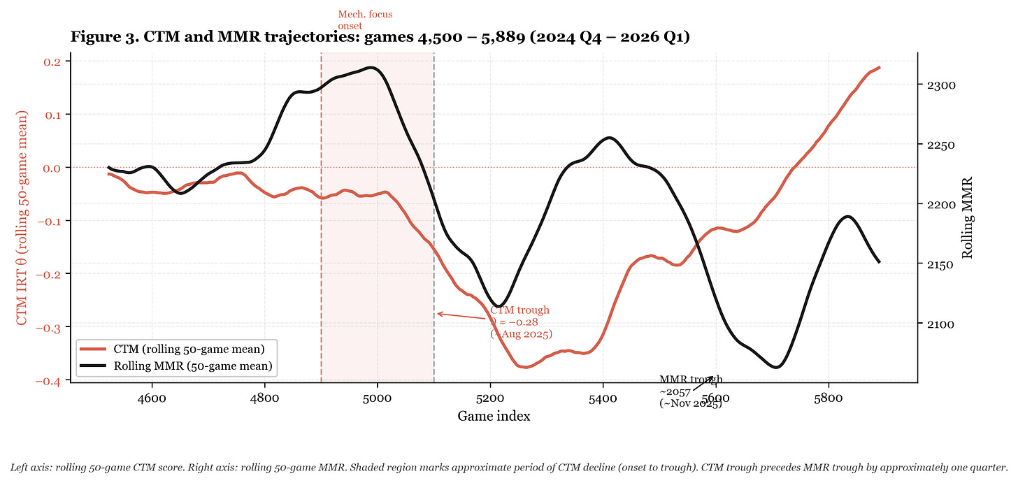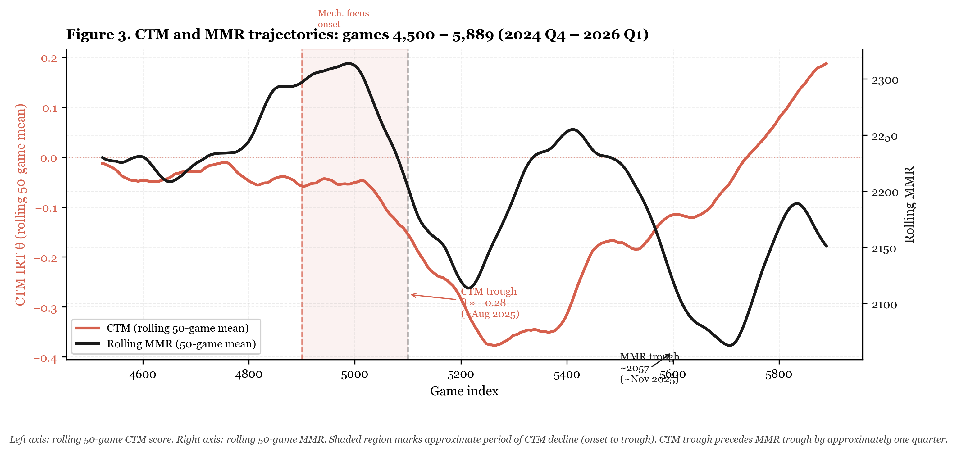 The timing matters. CTM reached its lowest point approximately in August 2025 (around game 5,100). The MMR trough, the period of lowest sustained rating, came approximately in November 2025 (around game 5,600). The behavioral signal led the outcome measure by roughly one quarter.