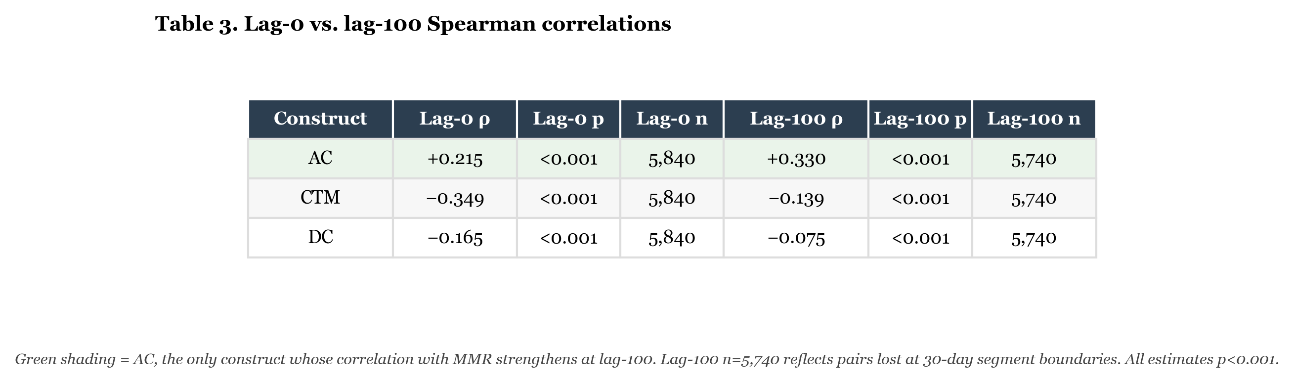 Figure 5. Contemporaneous (lag-0, n=5,840) and lagged (lag-100, n=5,740) Spearman correlations between construct scores and MMR. AC strengthens positively (+0.215 → +0.330). CTM (−0.349 → −0.139) and DC (−0.165 → −0.075) remain negative but attenuate toward zero. All estimates p<0.001.