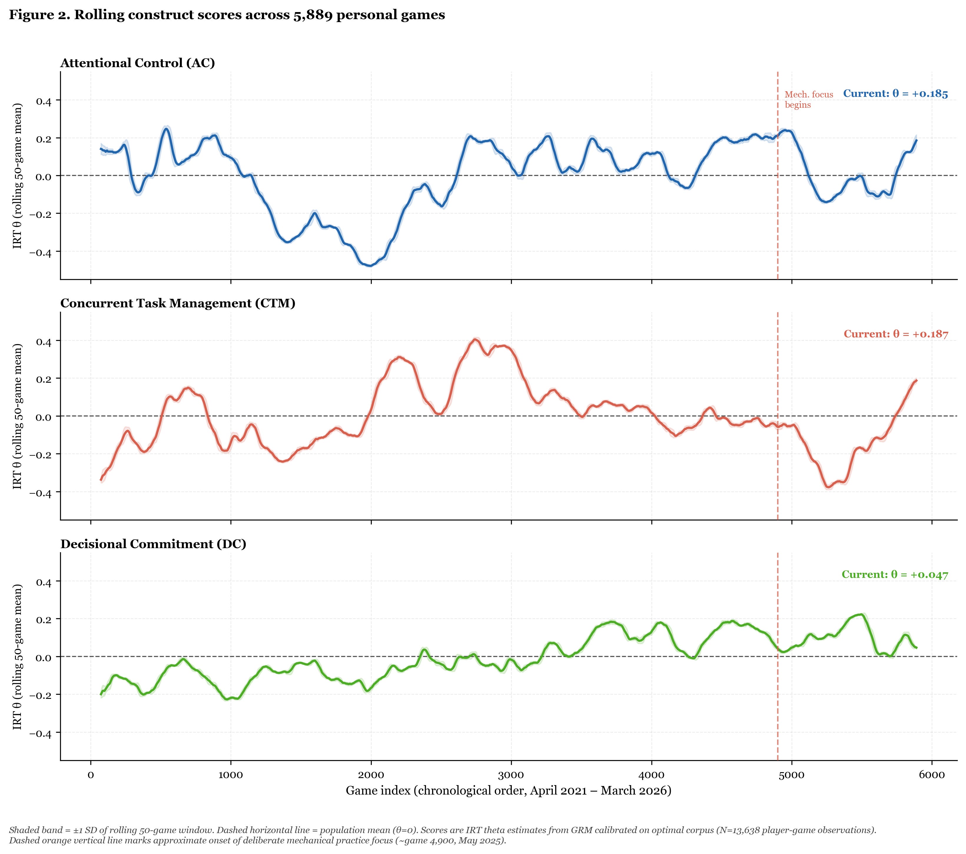Figure 2. Rolling 50-game mean construct scores (IRT theta) by game index. Dashed horizontal line indicates population mean (θ=0). Red vertical line marks approximate onset of deliberate mechanical practice focus (~game 4,900, May 2025).
