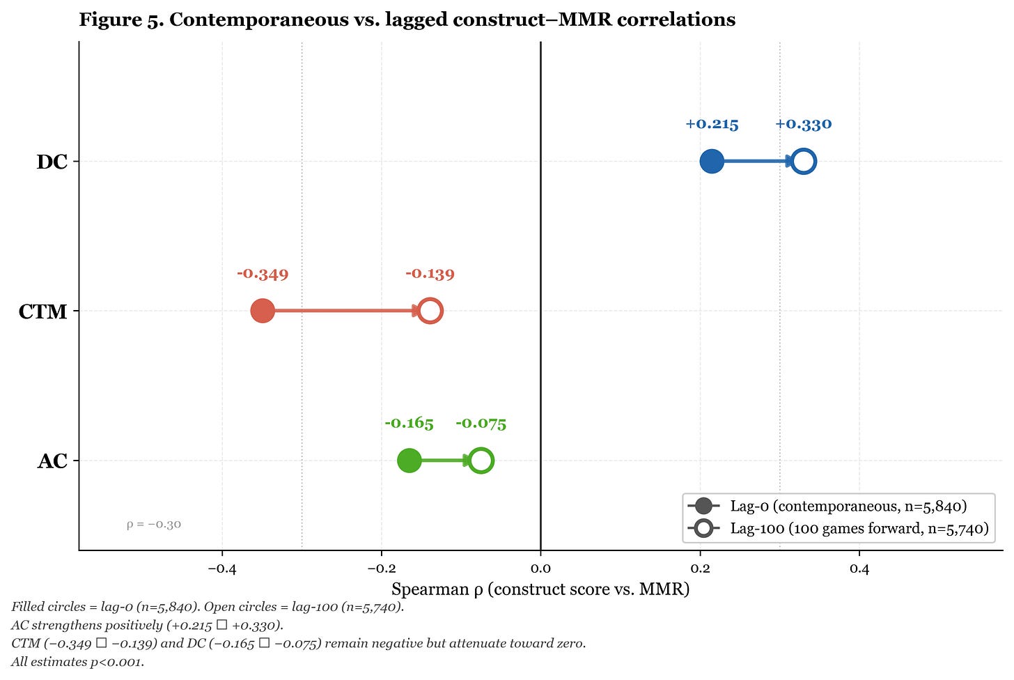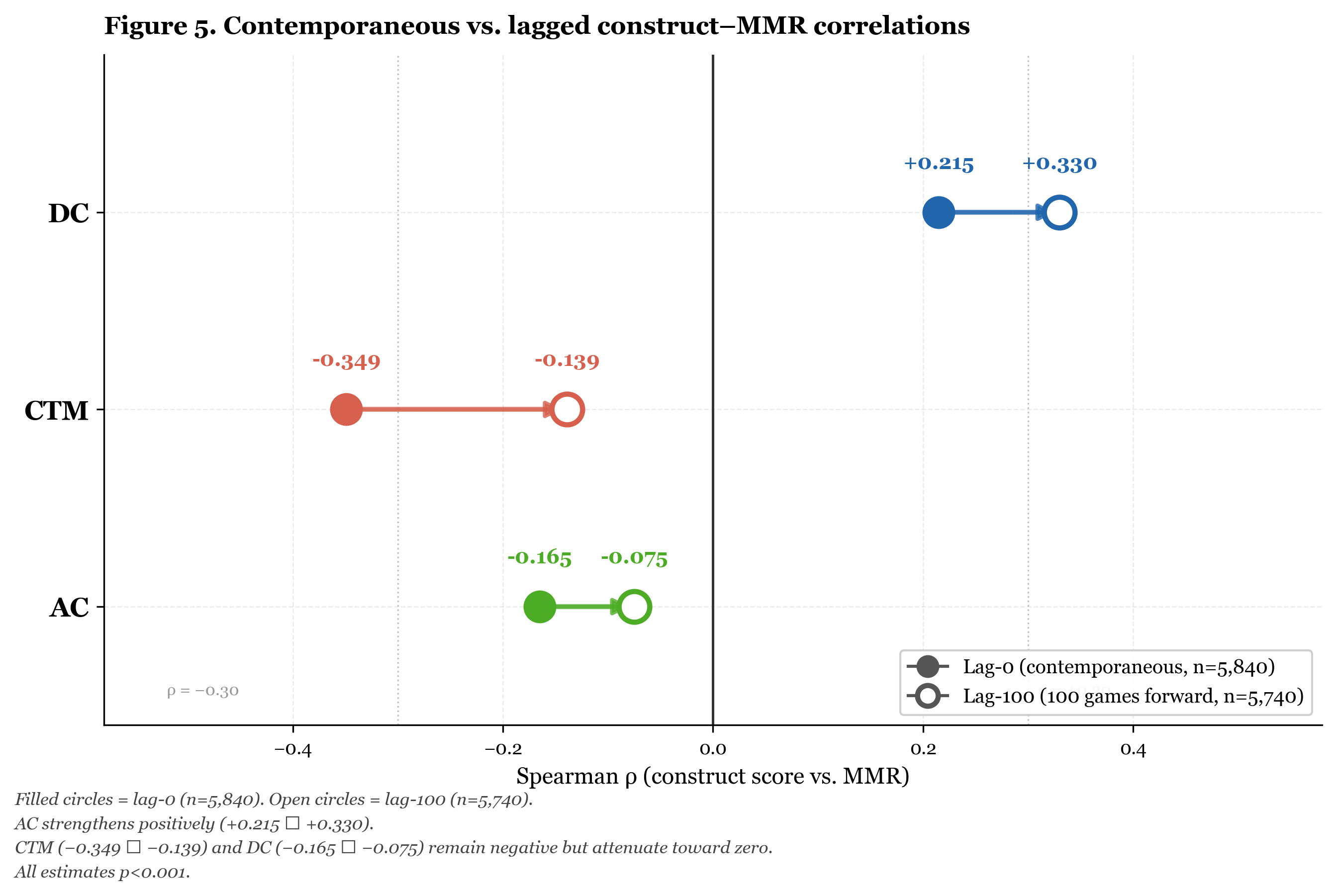 Table 3. Spearman correlations between construct scores and MMR at lag-0 (contemporaneous) and lag-100 (behavioral score compared to MMR 100 games later). Lag-100 n=5,740 reflects pairs lost at segment boundaries where gaps in the play record exceed 30 days. All estimates significant at p<0.001.
