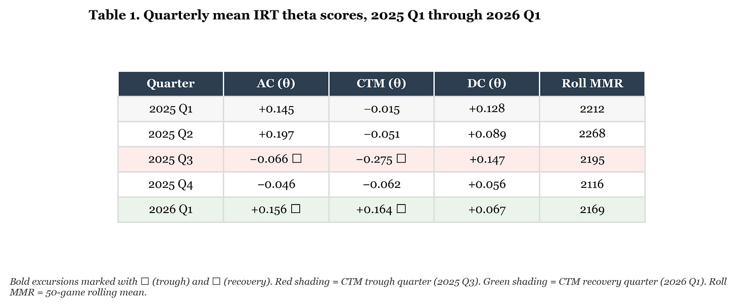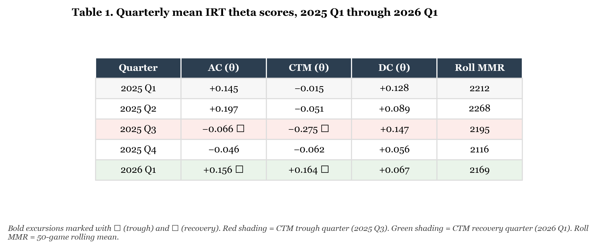 CTM in 2026Q1: +0.164. This is the highest positive quarterly CTM mean since 2023Q4 (+0.338). The 2023Q4 peak has a straightforward explanation: I was working through PiG and uThermal’s Bronze to GM series during that period and focusing explicitly on macro fundamentals: production consistency, supply management, Orbital Command discipline. The behavioral record shows the same signature as the 2025 mechanical focus period, compressed into a single quarter. Two deliberate practice interventions, two years apart, both legible in the same construct.