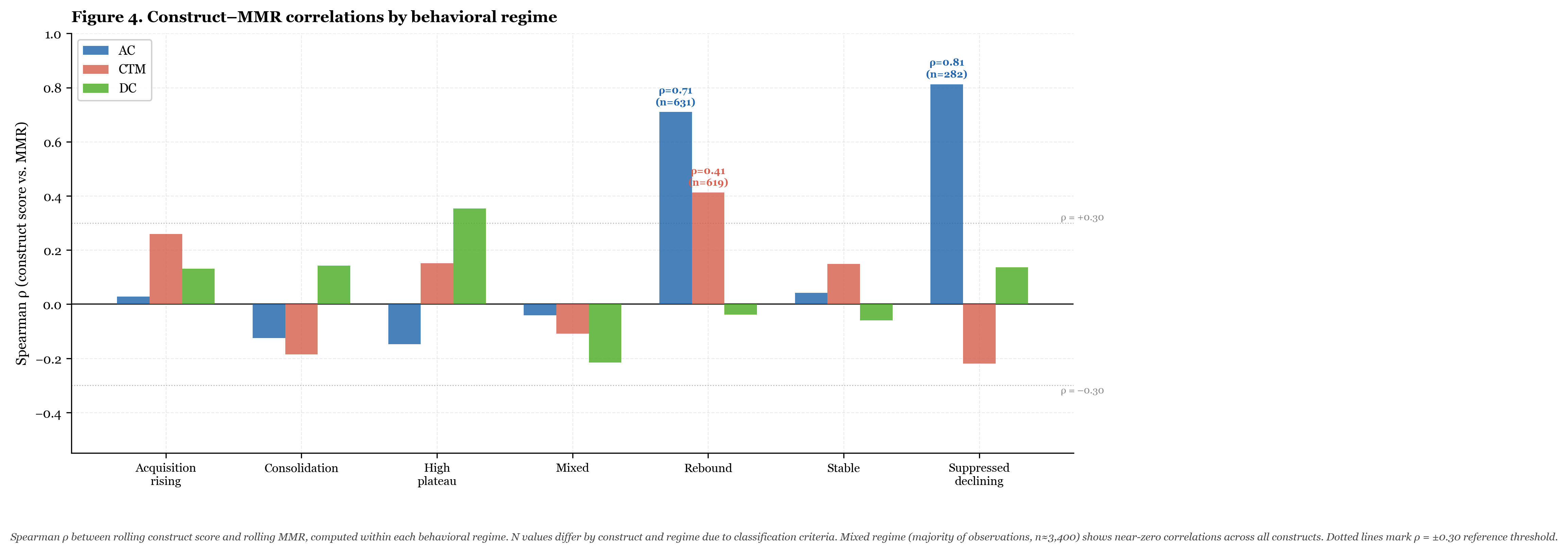Figure 4. Regime-conditional Spearman correlations between construct scores and MMR. The mixed regime (majority of observations) shows near-zero to weakly negative correlations across all constructs. Extreme correlations emerge only during suppressed_declining and rebound regimes.