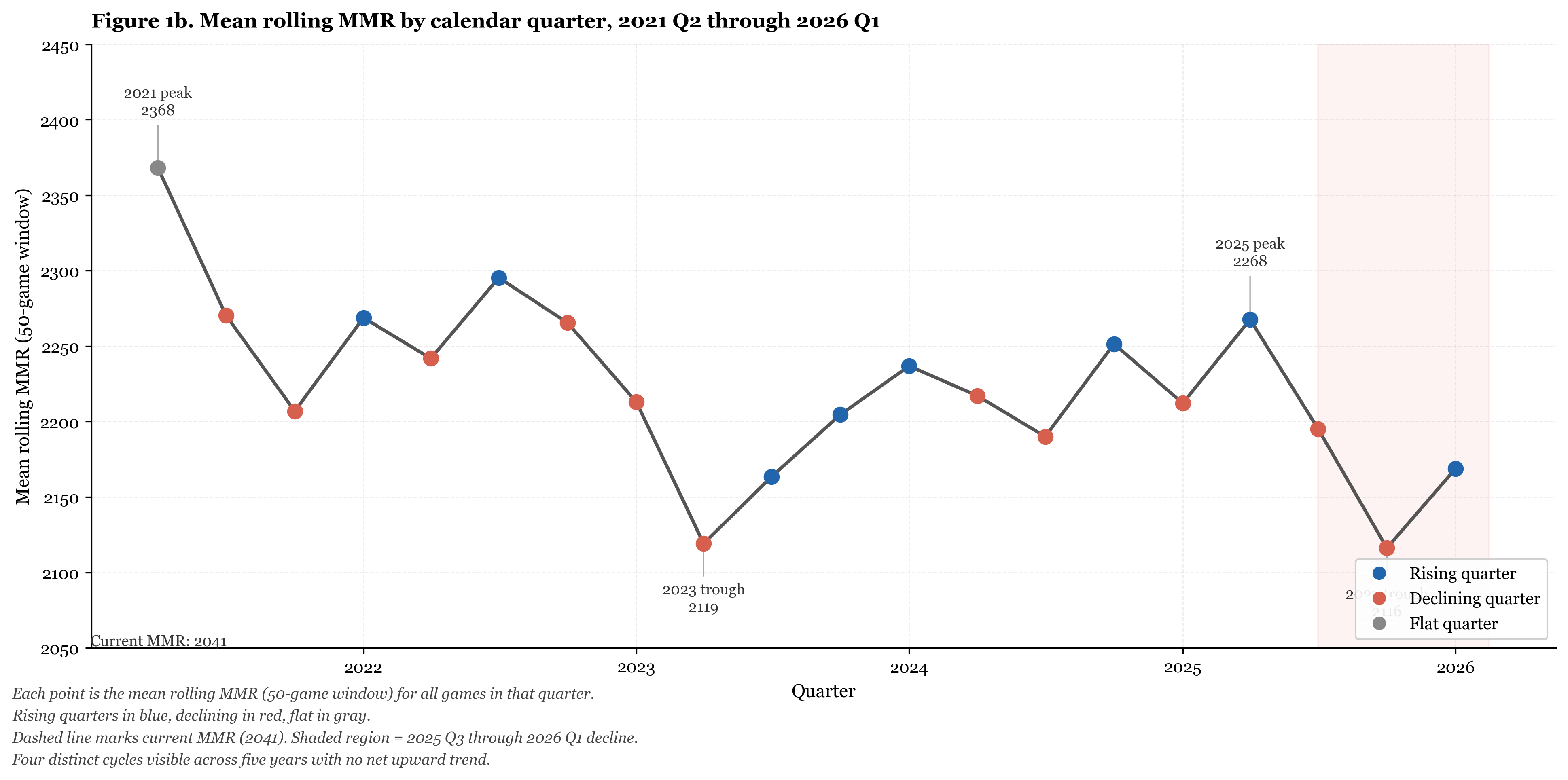 Figure 1b. Mean rolling MMR by calendar quarter, 2021 Q2 through 2026 Q1. Rising quarters shown in blue, declining in red. Dashed line marks current MMR (2041). The series shows four distinct cycles across five years with no net upward trend.