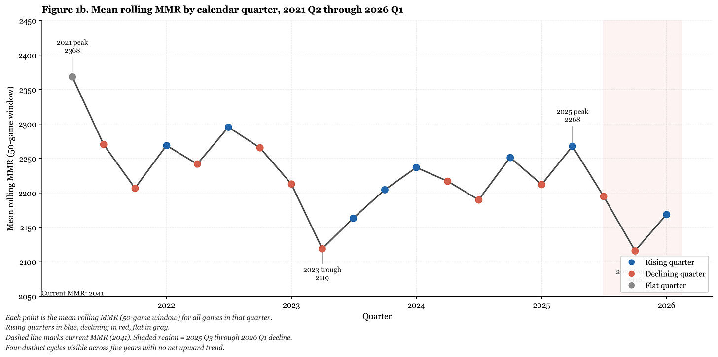 This is not a causal claim. The MMR decline had multiple contributors and I am not in a position to fully decompose them. But the sequence is consistent with the deliberate practice hypothesis: behavior degrades first, performance outcome degrades with a lag, then behavior recovers, and the outcome begins recovering after.